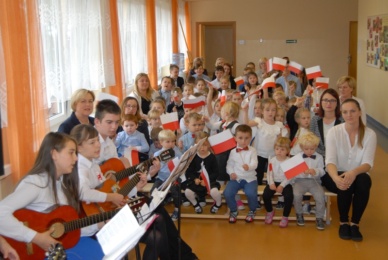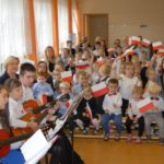 Obchody tego wydarzenia zaczęliśmy od wspólnego odśpiewania hymnu narodowego. Następnie uczniowie klas 3 i 6, przedstawiając montaż słowno-muzyczny, przypomnieli zebranym o trudnej historii naszej ukochanej OJCZYZNY. Niech słowa Romana Dmowskiego wypowiadane przez jednego z naszych aktorów pozostaną z nami na zawsze:” Jestem Polakiem – to znaczy, że należę do narodu polskiego zarówno dziś, jak i w wiekach ubiegłych i w przyszłości. Jestem Polakiem i wszystko, co polskie jest moje i niczego się wyrzec nie mogę.”