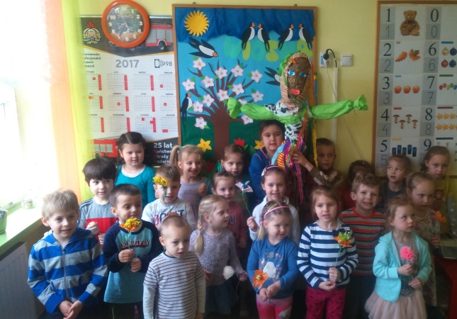 21 marca w naszym przedszkolu i w kl. „0” oficjalnie rozpoczęła się wiosna. Przedszkolaki zgodnie z tradycją pożegnały zimę i powitały wiosnę. Tego dnia zajęcia rozpoczęliśmy od przygotowania kolorowej sukni dla naszej Marzanny, wspólnie rozmawialiśmy o ludowej tradycji związanej z topieniem Marzanny. Ubrana w kolorowy strój ozdobiona wstążkami z bibuły Marzanna niesiona przez dzieci wyruszyła z przedszkola do pobliskiej rzeki Biała. (marzanna wykonana została z elementów biodegradalnych, aby nie powodować zanieczyszczeń środowiska). Zgromadzone wokół słomianej panny dzieci ze śpiewem i donośnymi okrzykami pożegnały zimę: „Marzanno, Marzanno Ty zimowa panno, ciebie już pożegnamy, bo wiosnę witamy”. Przedszkolaki w wiosennych nastrojach i uśmiechem na twarzy wróciły do swoich codziennych zajęć pełne nadziei, iż nadchodzące cieplejsze dni już wkrótce pozwolą na ulubioną zabawę w przedszkolnym ogrodzie.