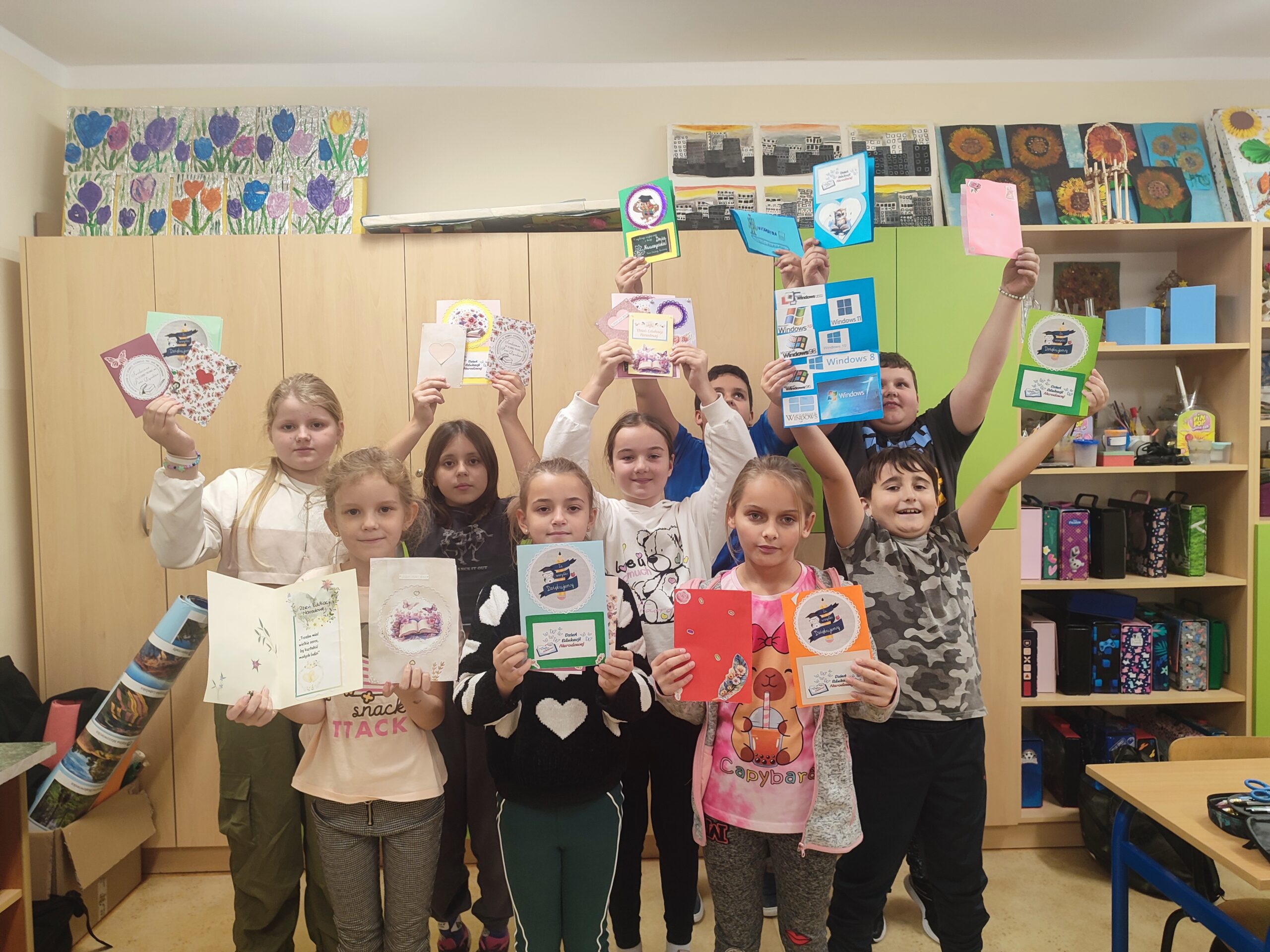 Z okazji Dnia Edukacji Narodowej uczniowie klas 4–5 podczas lekcji techniki przygotowali wyjątkowe prace plastyczne dla swoich nauczycieli. Własnoręcznie wykonali kartki z życzeniami, które później zostały wręczone nauczycielom w ramach szkolnych obchodów tego święta.