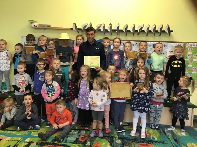 Nawiązując do podjętej tematyki zawodów, kilka dni temu gościliśmy w naszym przedszkolu Pana Mariusza Szatko, wujka Julii i Tomka, którego świat pszczół zafascynował tak bardzo, iż postanowił dzielić się swoją pasją z innymi. Zaproszony Gość w ciekawy sposób opowiadał dzieciom o życiu pszczół, ich pracy, zwyczajach oraz znaczeniu tych owadów w przyrodzie. Przedszkolaki dowiedziały się, czym się żywią, jak spędzają zimę w ulu i jak produkują smaczny, słodki i zdrowy miód. Dzieci mogły z bliska obejrzeć przyrządy pszczelarza (ubranie, podkurzacz, ramkę), produkty wytworzone przez pszczoły (kit pszczeli i miód), którego każdy mógł spróbować. Spotkanie z pszczelarzem poszerzyło wiedzę dzieci na temat szeroko pojętego pszczelarstwa oraz umożliwiło bliski kontakt z produktami stworzonymi przez naturę.