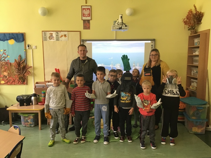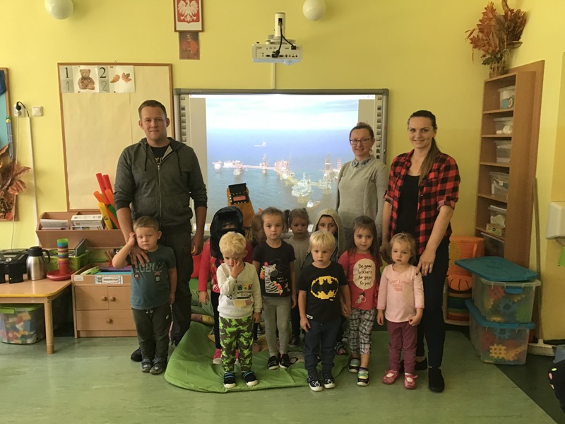 spawacza na platformie wiertniczej w norweskiej części Morza Północnego a prywatnie tatę Antosia z grupy „Biedronki”. Swoją wizytę rozpoczął krótką pogadanką na temat tego kim jest spawacz i czym się zajmuje na platformie wiertniczej. Zaprezentował swoje narzędzia oraz ubiór, który chroni przed niebezpiecznym światłem, które wydziela się podczas spawania oraz kiedy musi pracować w ekstremalnych warunkach. O platformach mówi się, że to małe miasta – więc tak jak w mieście, przebywają tam ludzie o różnych umiejętnościach, załoga liczy kilkaset osób. Na platformach znajdują ludzie zajmujący się zadaniami związanymi z funkcją platformy, jej obsługą, ale też z zadaniami związanymi z zakwaterowaniem i gastronomią. Oprócz spawaczy są tam również elektrycy, wiertacze, chemicy, personel medyczny, kucharze itp. Na platformie znajduje się również miejsce, gdzie można się zrelaksować i odpocząć. Na platformę Pan Wojciech przylatuje helikopterem i przebywa tam dwa tygodnie. W związku ze specyficznymi warunkami panującymi na takim obiekcie praca nie jest odpowiednia dla każdego. Panują tam silne wiatry i jest dosyć zimno. Aby móc pracować na platformie trzeba przejść odpowiednie szkolenia oraz, w zależności od stanowiska, posiadać odpowiednie uprawnienia i kwalifikacje. Dla wszystkich przedszkolaków spotkanie z spawaczem było ciekawą przygodą.