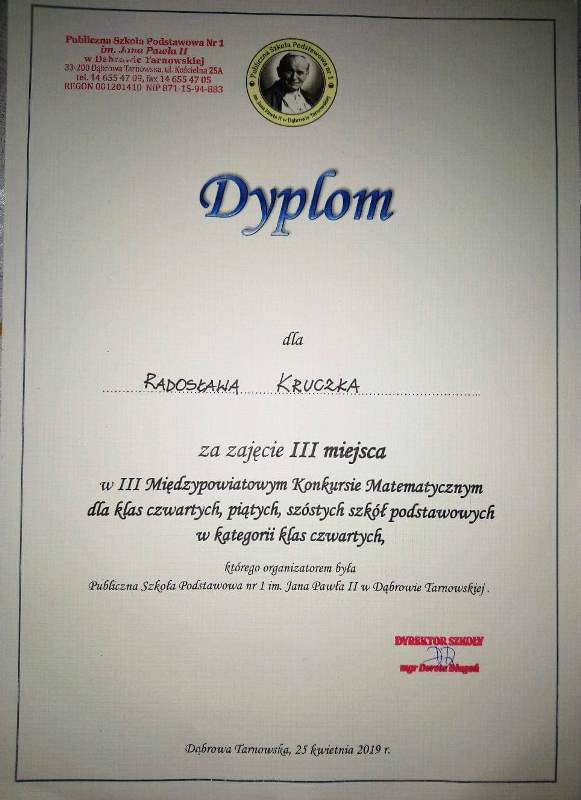 Uczeń naszej szkoły z klasy 4 Radosław Kruczek zajął 3 miejsce w Międzypowiatowym Konkursie Matematycznym.