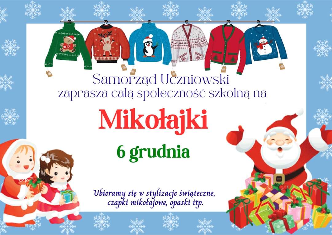 6 grudnia z okazji mikołajek Samorząd Uczniowski w naszej szkole wprowadził na ten dzień obowiązkowy stój z elementami czerwonymi lub świątecznymi. Każda klasa obchodziła „klasowe mikołajki” obdarowując się prezentami.