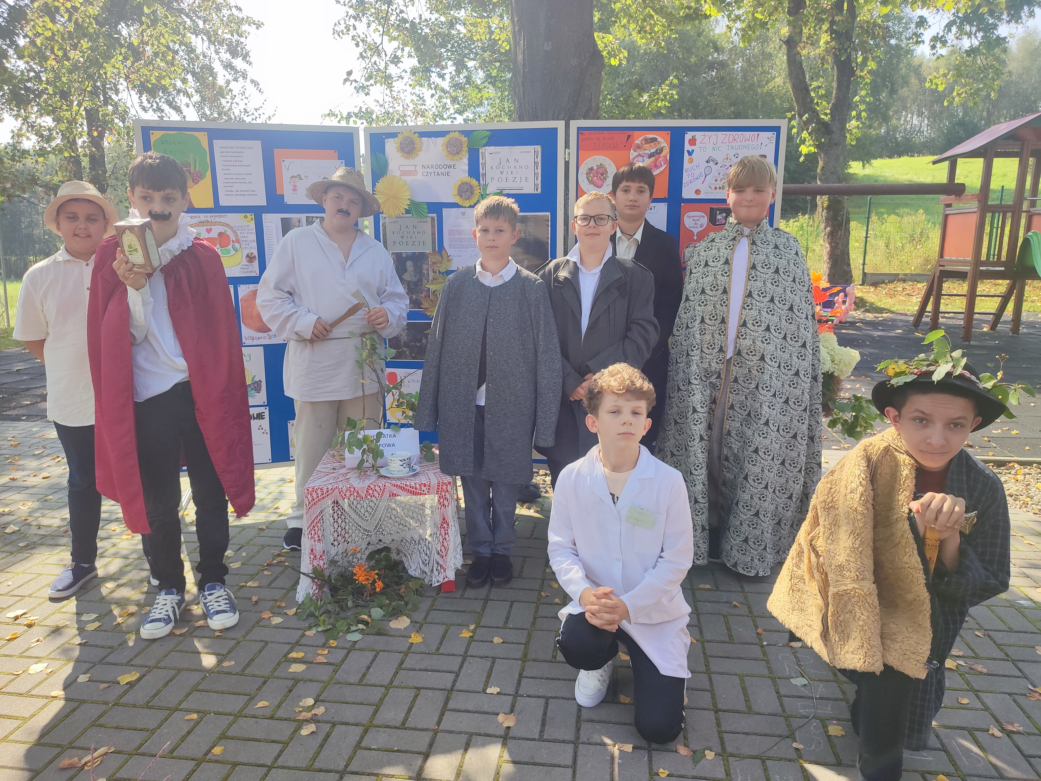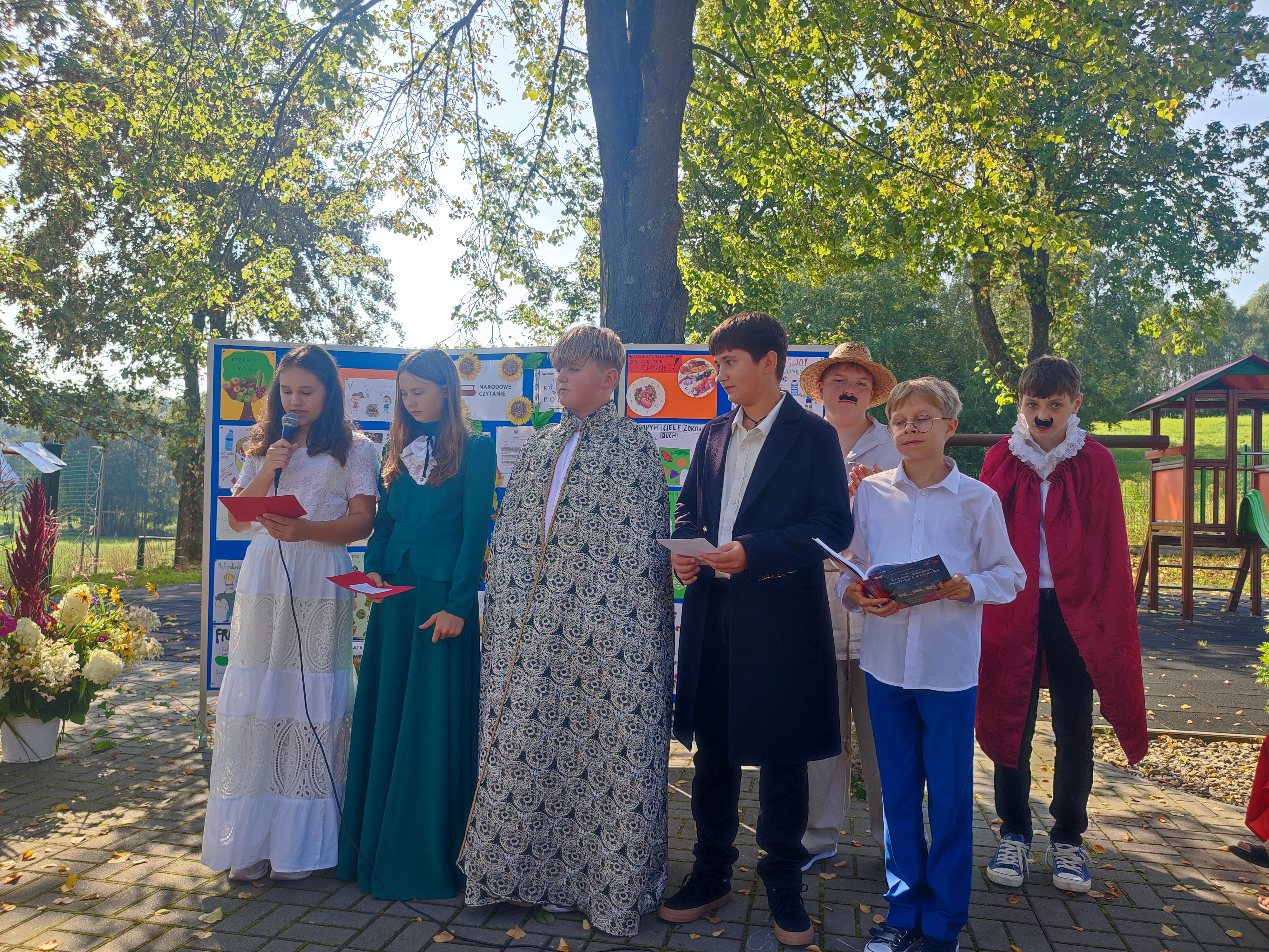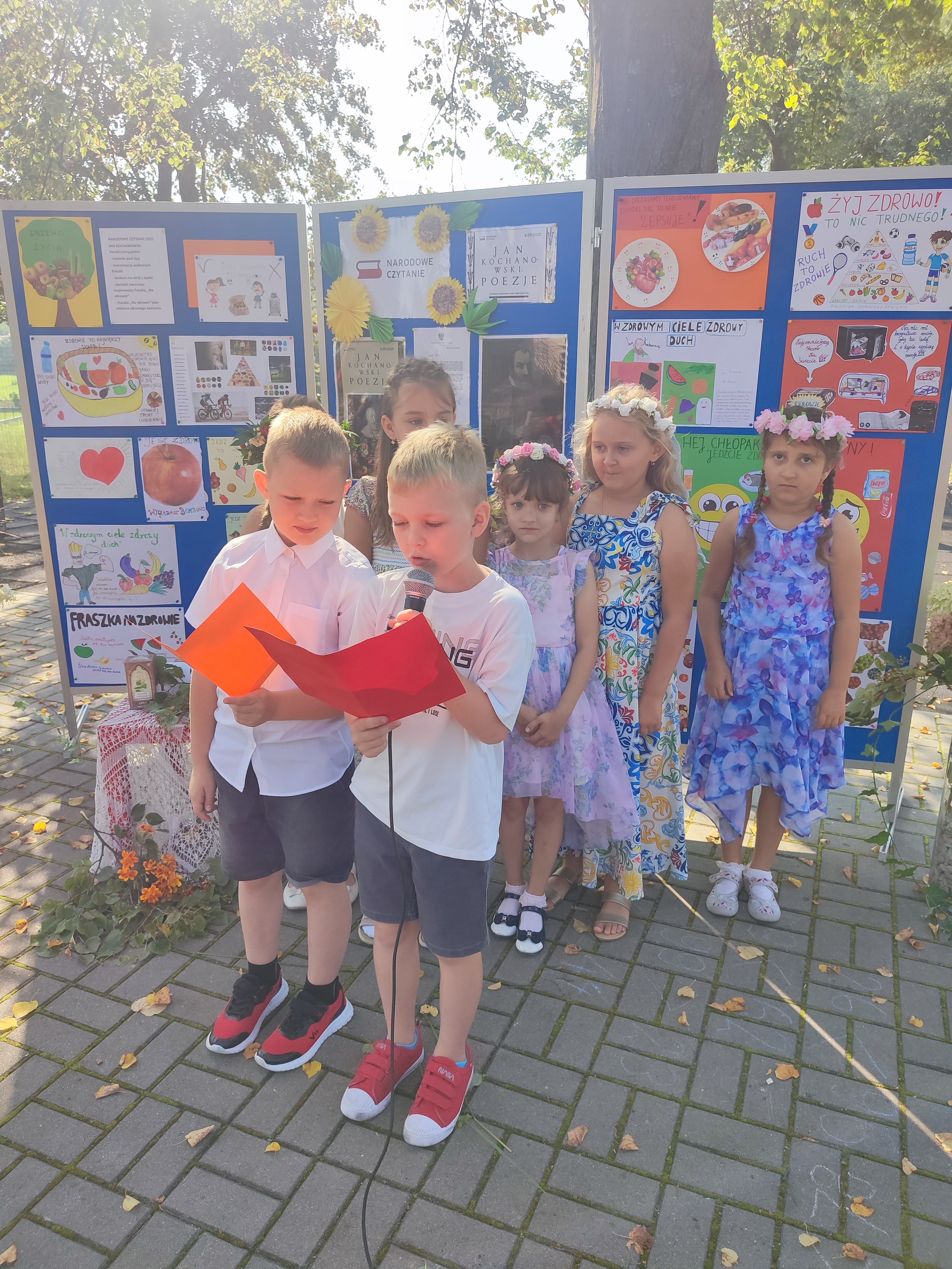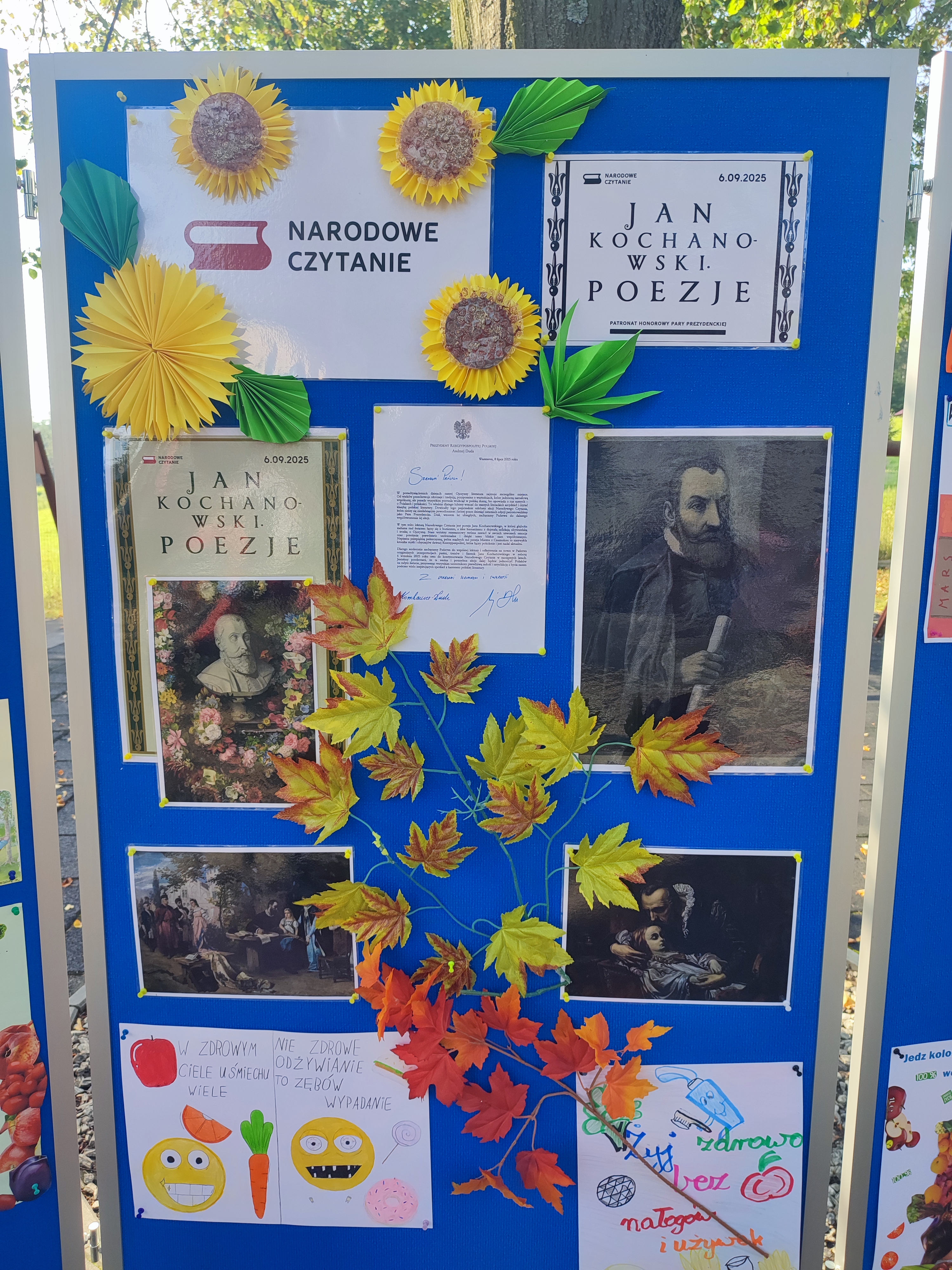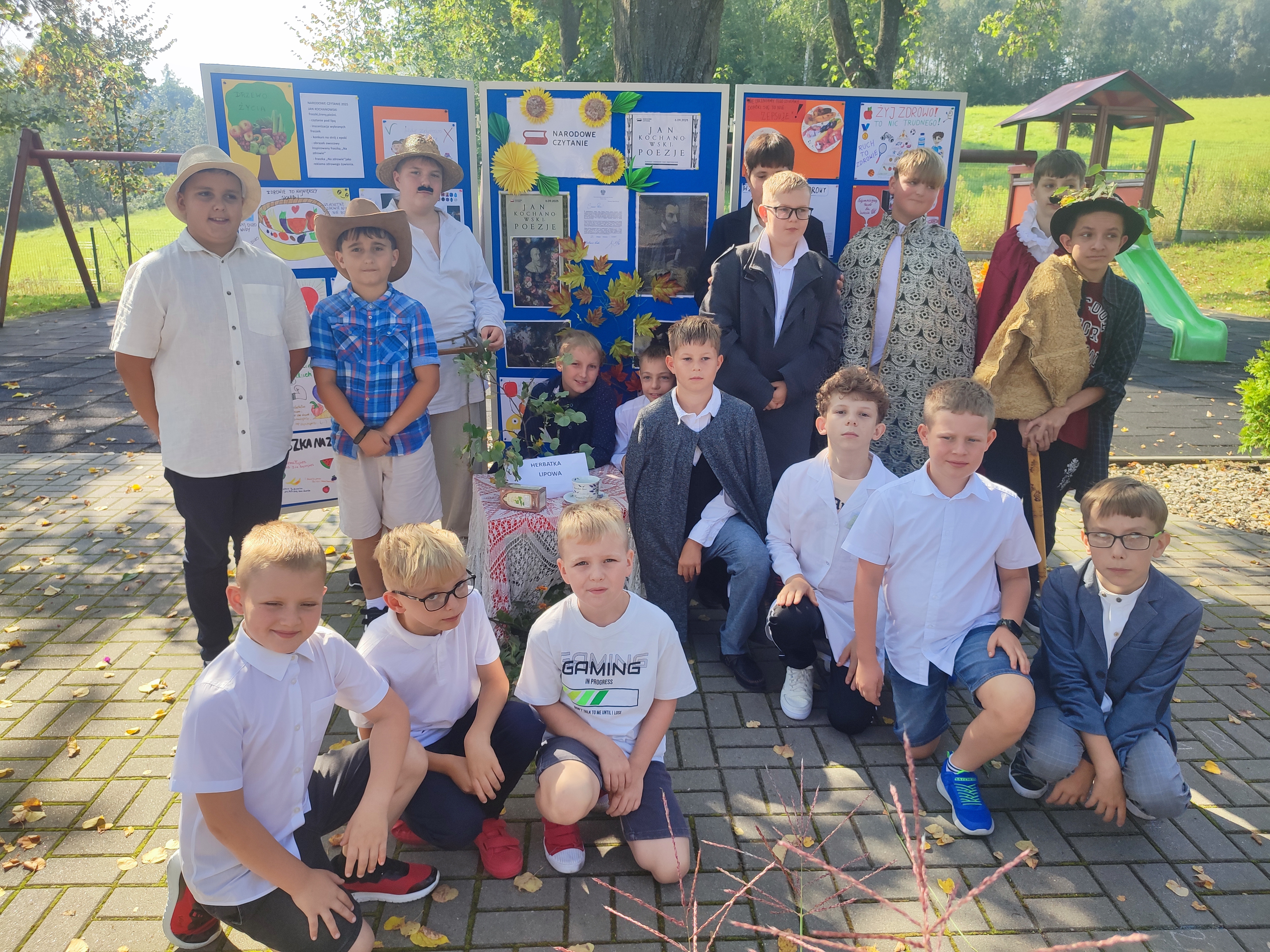 W piątek 5 września w naszej szkole odbyło się Narodowe Czytanie. W tym roku czytaliśmy utwory Jana Kochanowskiego. Ten renesansowy poeta uznawany jest za ojca literatury polskiej. Tworzył pieśni, fraszki i treny. Chodź mistrz z Czarnolasu żył w XVI w. jego utwory są aktualne do dziś. Akcja Narodowego Czytania w naszej szkole po raz kolejny odbyła się na świeżym powietrzu, na placu zabaw, w cieniu…lip. Była to świetna sceneria – szczególnie do odczytania fraszki „Na lipę”. Uczniowie klas II-VIII przedstawili piękne recytacje utworów Kochanowskiego. Dodatkową atrakcją były pomysłowe przebrania dzieci nawiązujące do epoki, w której żył poeta. Dekoracjami były plakaty promujące zdrowy styl życia zainspirowane fraszką „Na zdrowie”. następnie odbyły się warsztaty kulinarne. Uczniowie tworzyli na talerzykach obrazki z owoców. Oczywiście dzieła zostały zjedzone ze smakiem, ale wcześniej sfotografowane. Na koniec dzieci malowały kredą kolorowe półmiski pełne owoców. Pogoda dopisywała – nastroje również. A my po raz kolejny przekonaliśmy się, że czytanie to fantastyczna zabawa.