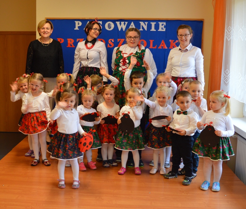 Setna rocznica odzyskania przez Polskę Niepodległości jest nie lada wydarzeniem w historii naszego kraju. Warto zatem przy każdej nadarzającej się okazji podkreślać ten fakt, stąd pomysł na folkowy charakter pasowania na przedszkolaka. Dzieci swym śpiewem, tańcem, recytacją ale przede wszystkim swą postawą udowodniły, iż zasługują na miano prawdziwego przedszkolaka. Pani Dyrektor swą „zaczarowaną” kredką zmieniła wszystkie dzieci w stu procentowych przedszkolaków.