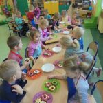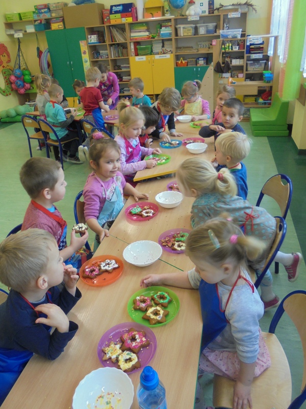 Grudzień to czas przygotowań do świąt. Korzystając z tej okazji przedszkolacy oraz zerówkowicze wraz ze swoimi paniami przystąpili do pracy. Pierwszym działaniem było przygotowanie pierniczków. Jest to tradycyjny bożonarodzeniowy przysmak, którym uwielbiają zajadać się wszyscy. Postanowiliśmy, że nasze pierniczki poza tym, że mają być smaczne powinny być „zdrowym słodyczem ”, dlatego też nasze ciasteczka zostały przygotowane z naturalnych składników mąki, miodu, jajek, masła. Kolejnym naszym postanowieniem było piękne ozdobienie naszych smakołyków, dlatego szybko zabraliśmy się do pracy. Po kilku chwilach zwyczajne, brązowe ciasteczka zyskały nowy wygląd. Po skończonej pracy uznaliśmy, że chętnie podzielimy się z innymi w związku z czym przekazaliśmy nasze pierniczki na kiermasz bożonarodzeniowy organizowany w naszej szkole.