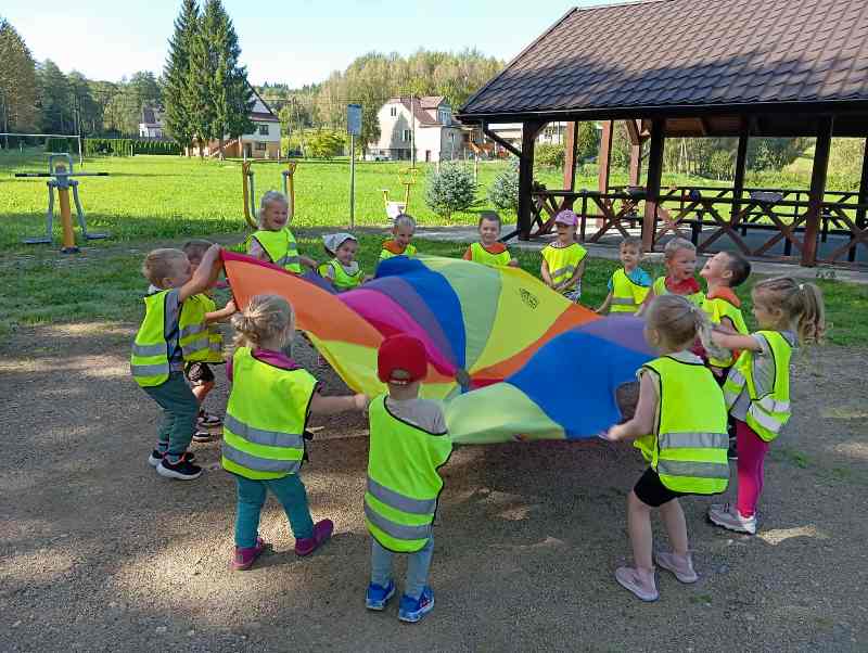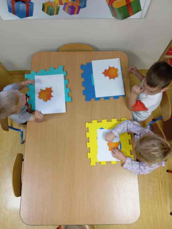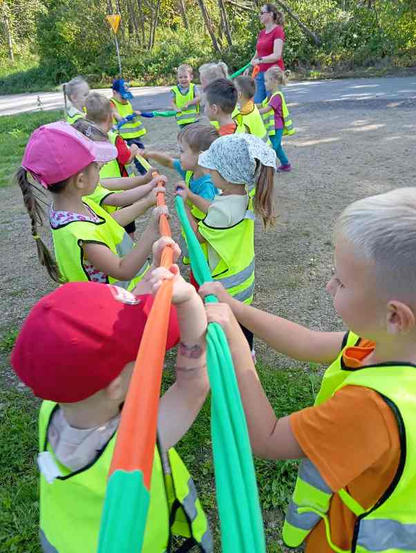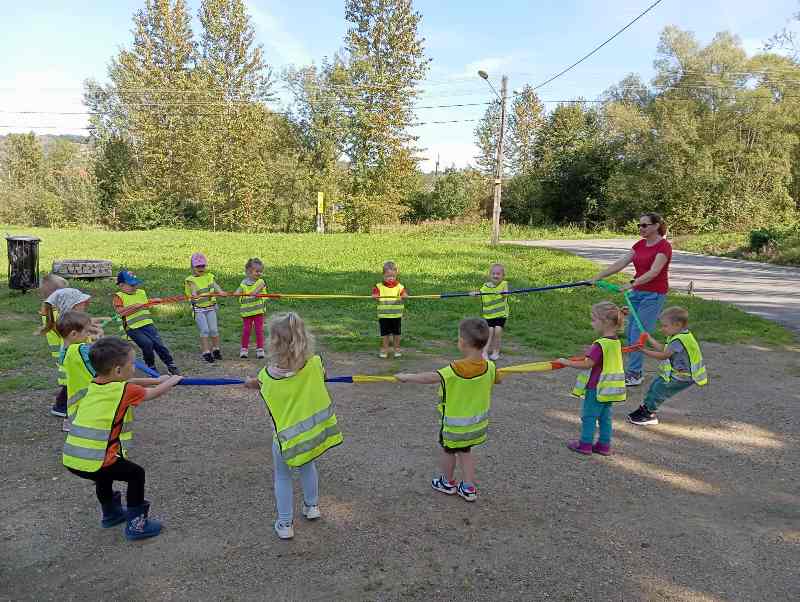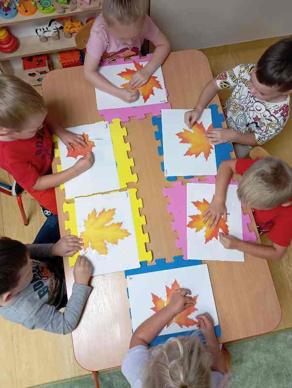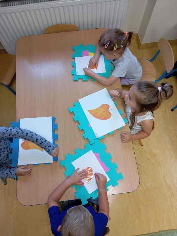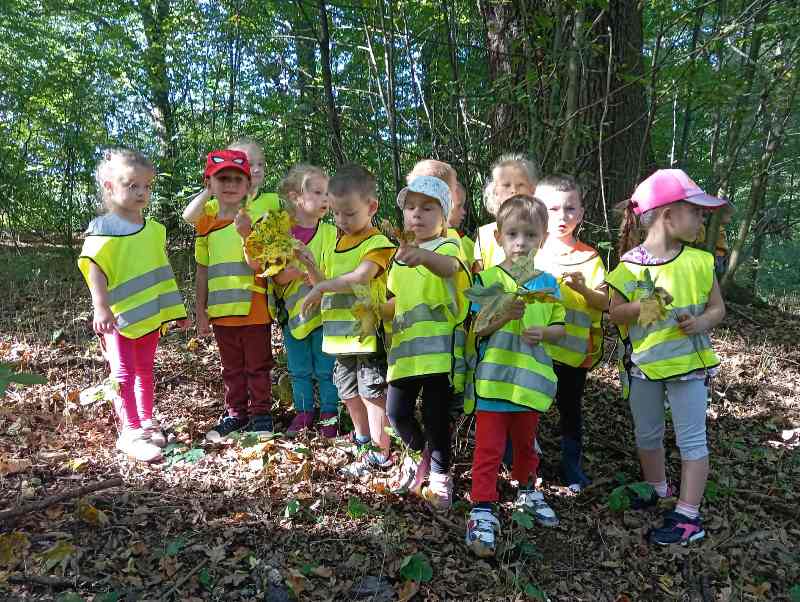 Jesień to piękna pora roku, która rozpoczyna się 23 września. Liście dębów, brzóz i innych drzew żółkną, czerwienią się i przybierają ciekawe ubarwienie, by później upaść i razem z innymi tworzyć kolorowy jesienny dywan. Grupa Biedronek tego dnia wybrała się na spacer do pobliskiego lasu w poszukiwaniu oznak jesieni. Dzieci obserwowały jesienny krajobraz, wypowiadały się na temat swoich spostrzeżeń, rozpoznawały drzewa liściaste oraz iglaste, obserwowały korę drzew. Opisywały wygląd znalezionych liści i zauważonych grzybów. Materiał przyrodniczy przyniesiony ze spaceru został wykorzystany do wykonania pracy plastycznej i umieszczony w kąciku przyrodniczym. A korzystając ze słonecznej pogody aktywnie spędziliśmy czas na powietrzu.