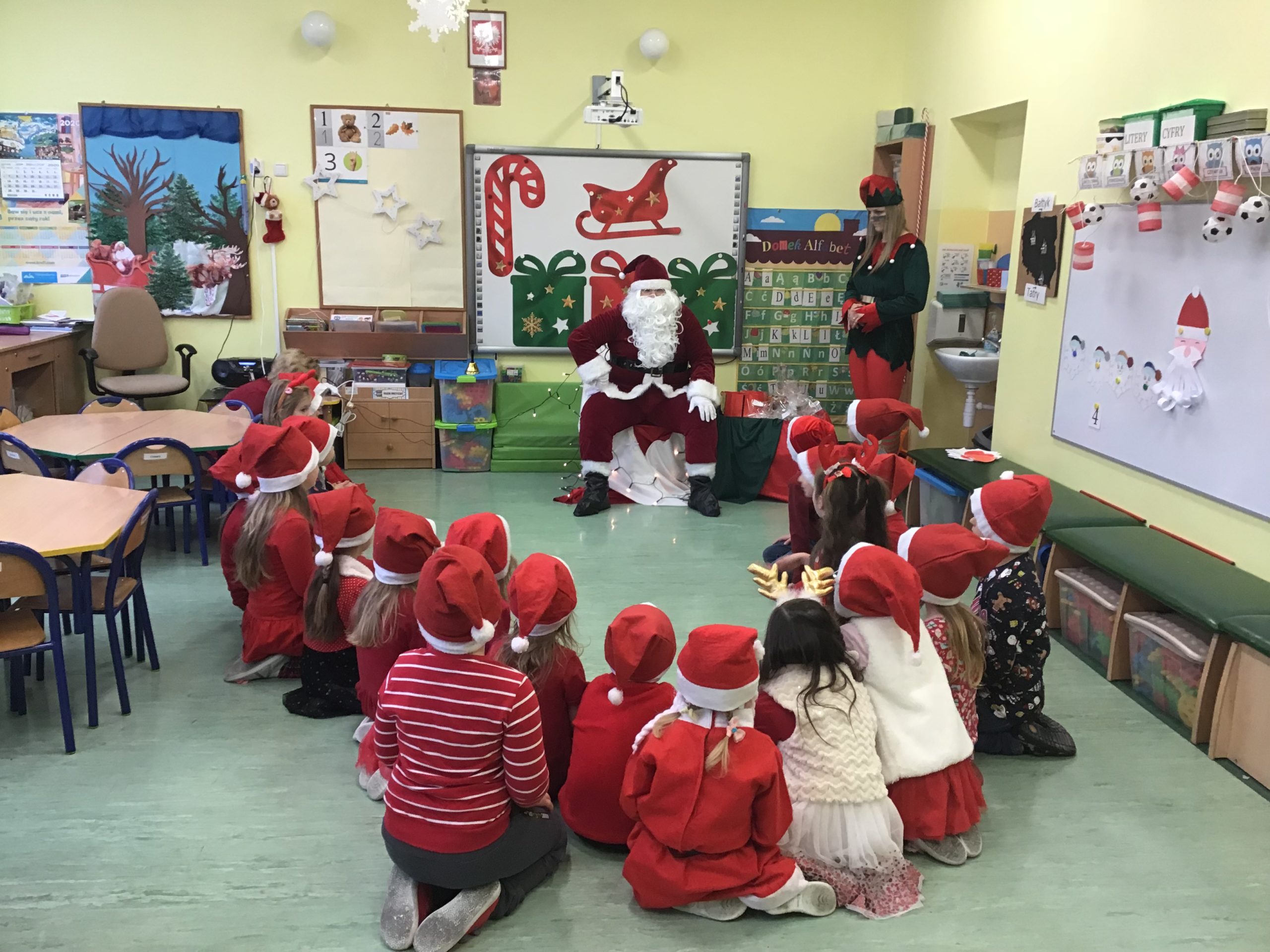 4 grudnia był dla grupy 0 „zaczarowanym dniem „. Wszyscy zamienili się w Mikołaje, Mikołajki i wyczekiwali na niezwykłego gościa. Dzieci przywitały go piosenką i wierszami. Zgodnie z maksymą, iż ” Dobro powraca” – oprócz prezentów dla wszystkich były również laurki i prezent dla Mikołaja. Mamy nadzieję, że będzie przydatny. Na zakończenie spotkania wszyscy razem zaśpiewali piosenkę- przesłanie „I ty możesz zostać świętym Mikołajem”. Dziękujemy Mikołaju i zapraszamy do odwiedzenia nas za rok.
