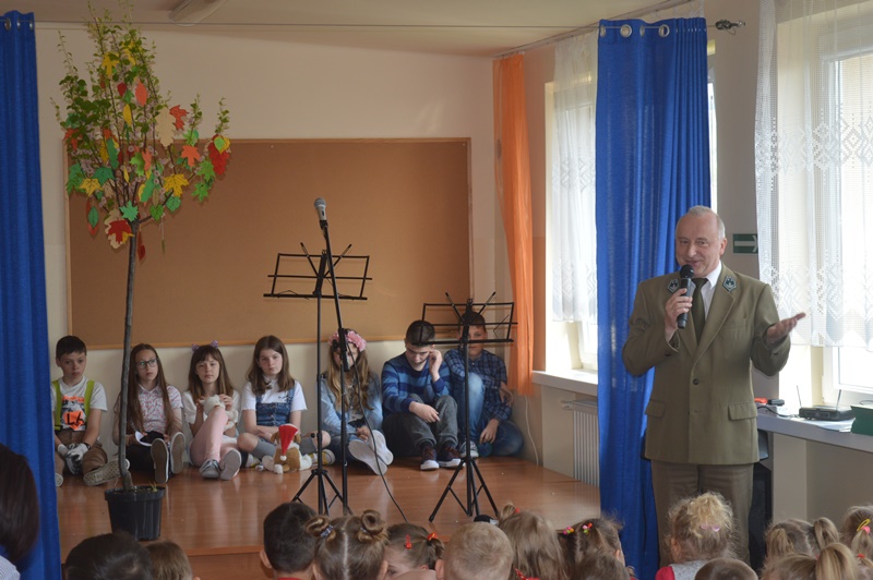 W okresie przedświątecznym wszyscy uczniowie i przedszkolaki napisali je na kolorowych listkach, które powiesili na zakupionym drzewku. Pan Grzegorz ciekawie opowiadał o korzyściach płynących z naszych okolicznych lasów, zapraszał w najbardziej urokliwe miejsca, wskazując jednocześnie na właściwe zachowania i szacunek dla przyrody. Ogrodnicy: Michał i Dominik posadzili migdałowca przed szkołą, a uczniowie z klasy szóstej odśpiewali piosenkę o konieczności przytulania psa i kota, sadzenia bluszczy i zapylaniu pelargonii.