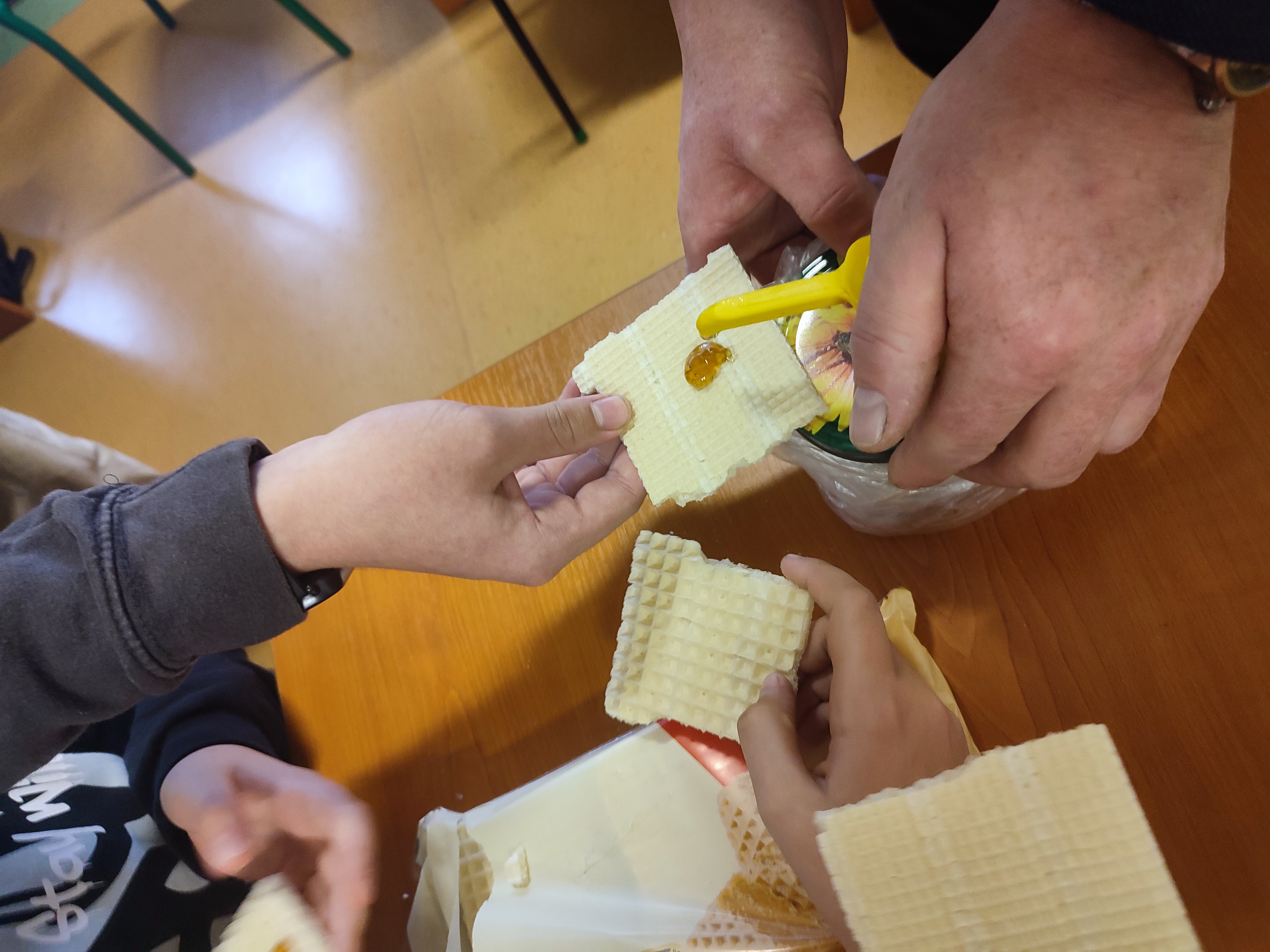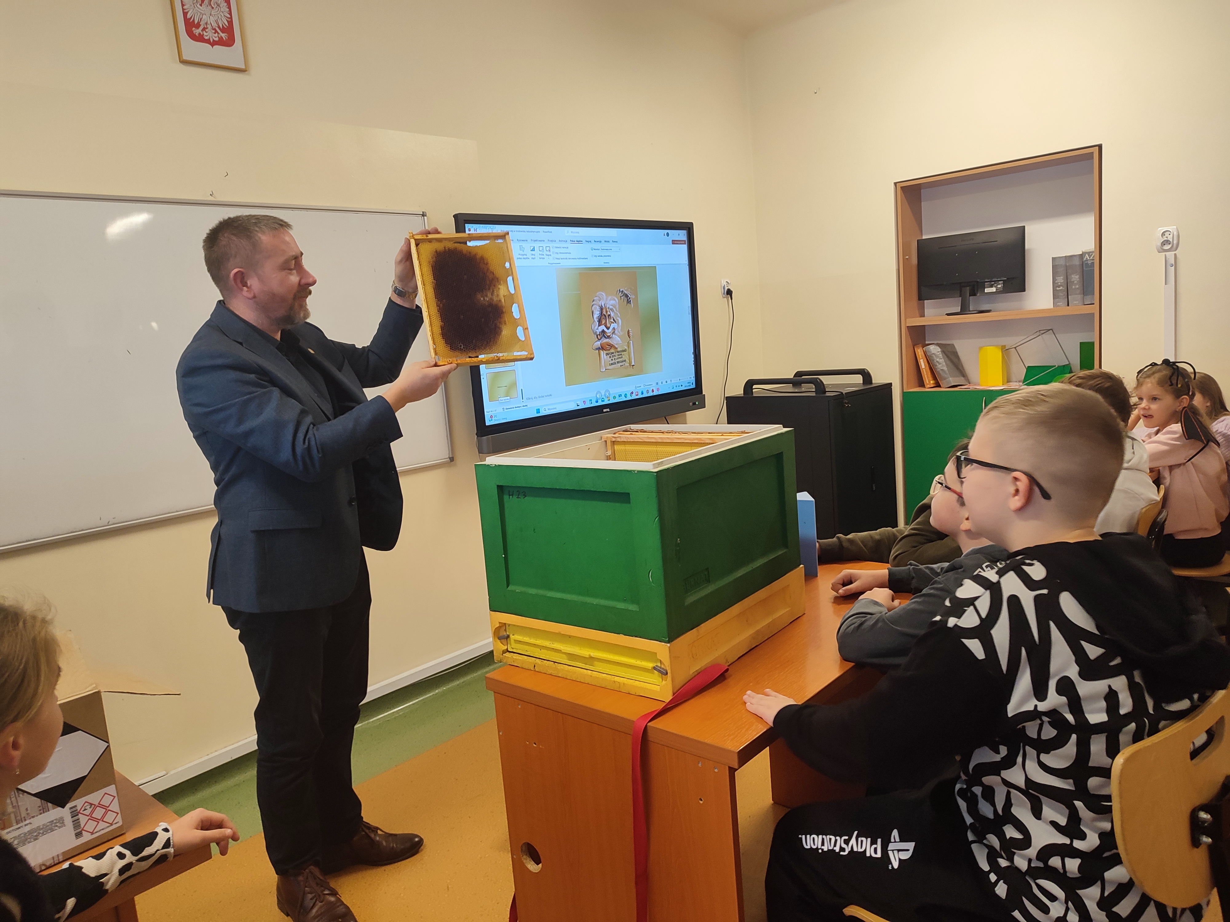Pan Paweł w ciekawy i przystępny sposób opowiedział o życiu pszczół, ich roli w ekosystemie oraz o tym, jak wygląda praca pszczelarza na co dzień. Uczniowie mieli okazję zobaczyć ramki z ula, miody różnego rodzaju, świece oraz różne rodzaje sprzętu używanego podczas pozyskiwania miodu. Dzieci z zaciekawieniem słuchały ciekawostek o królowej pszczół, robotnicach i trutniach, a także o tym, jak powstaje miód i dlaczego pszczoły są tak ważne dla środowiska.
