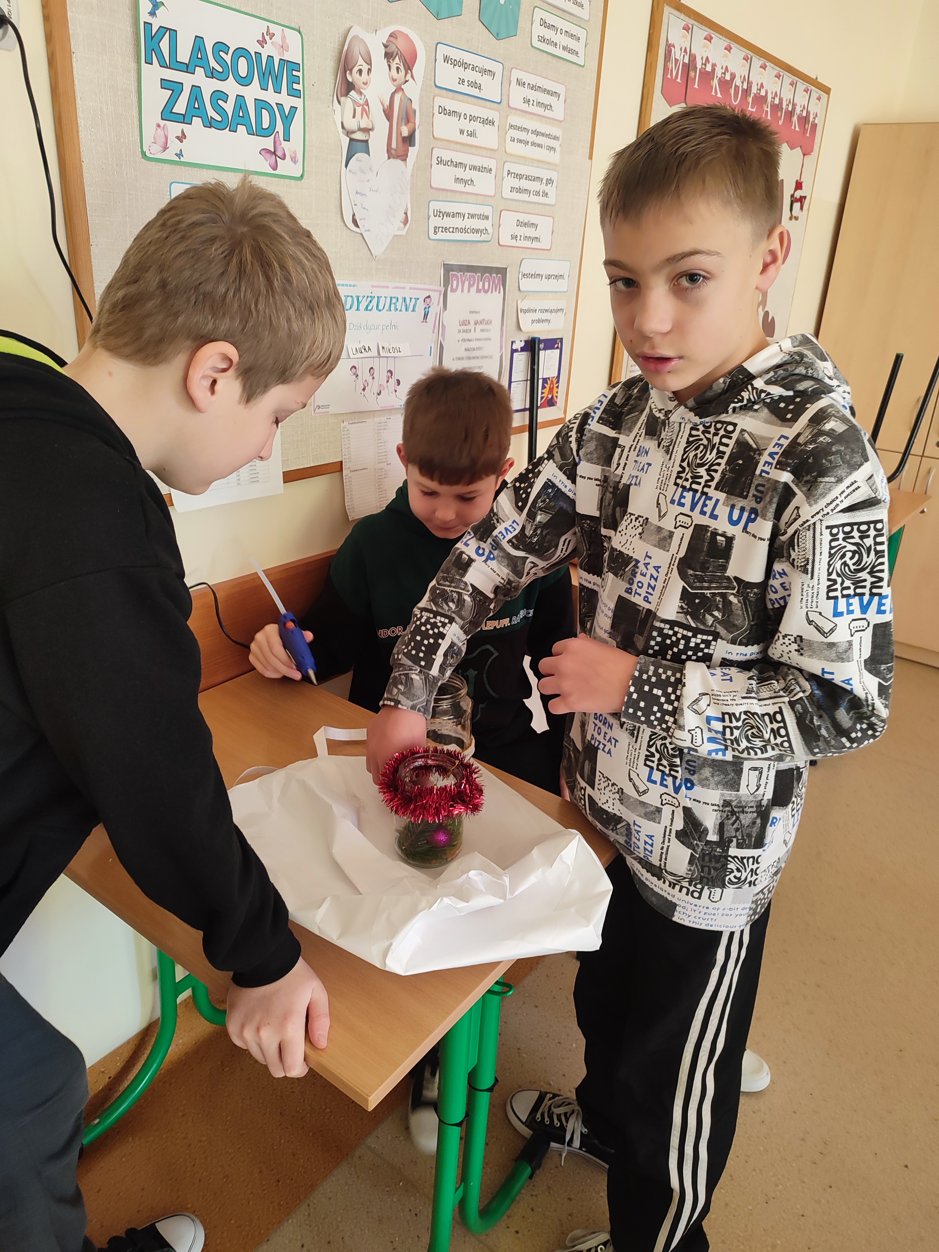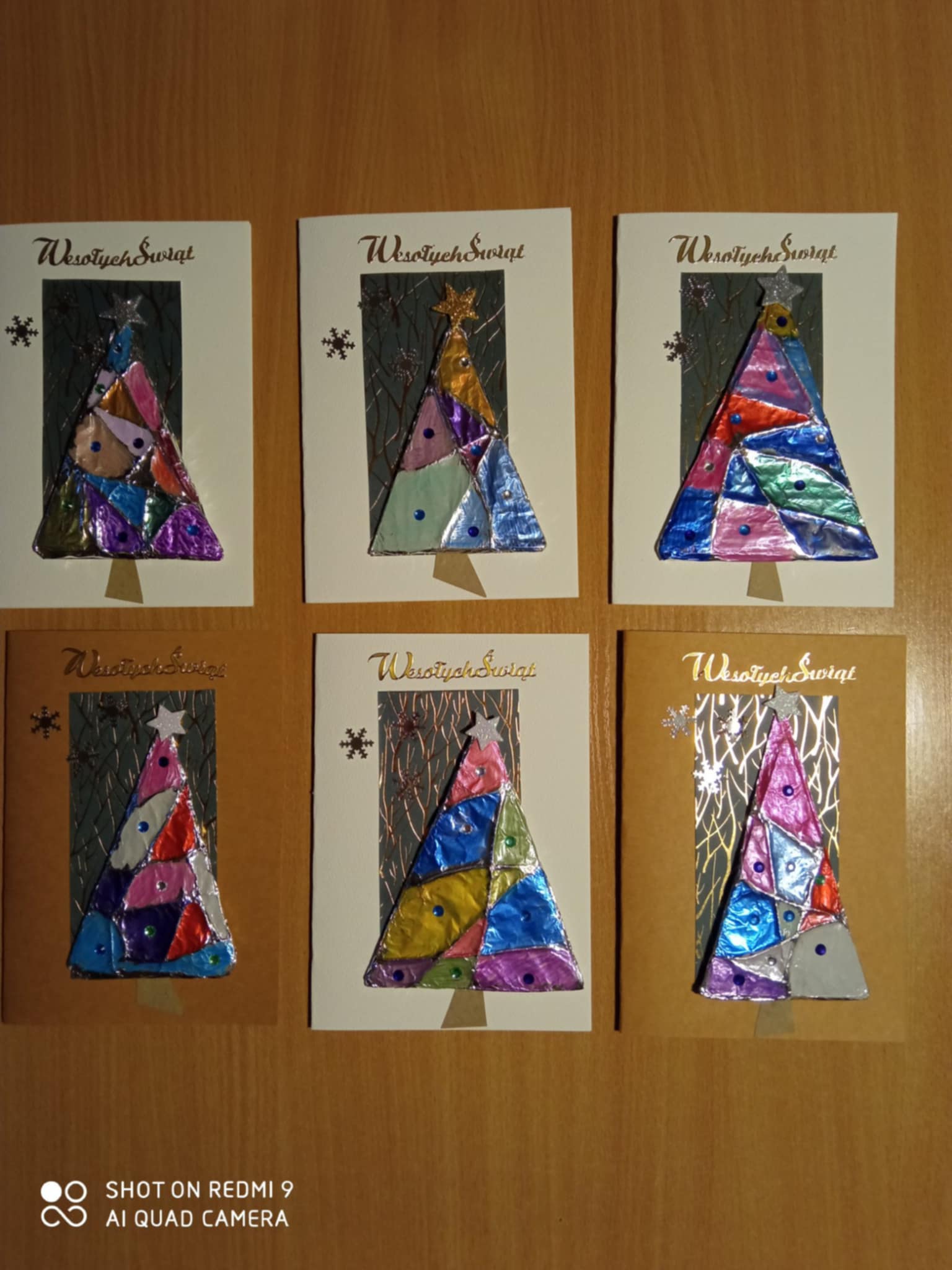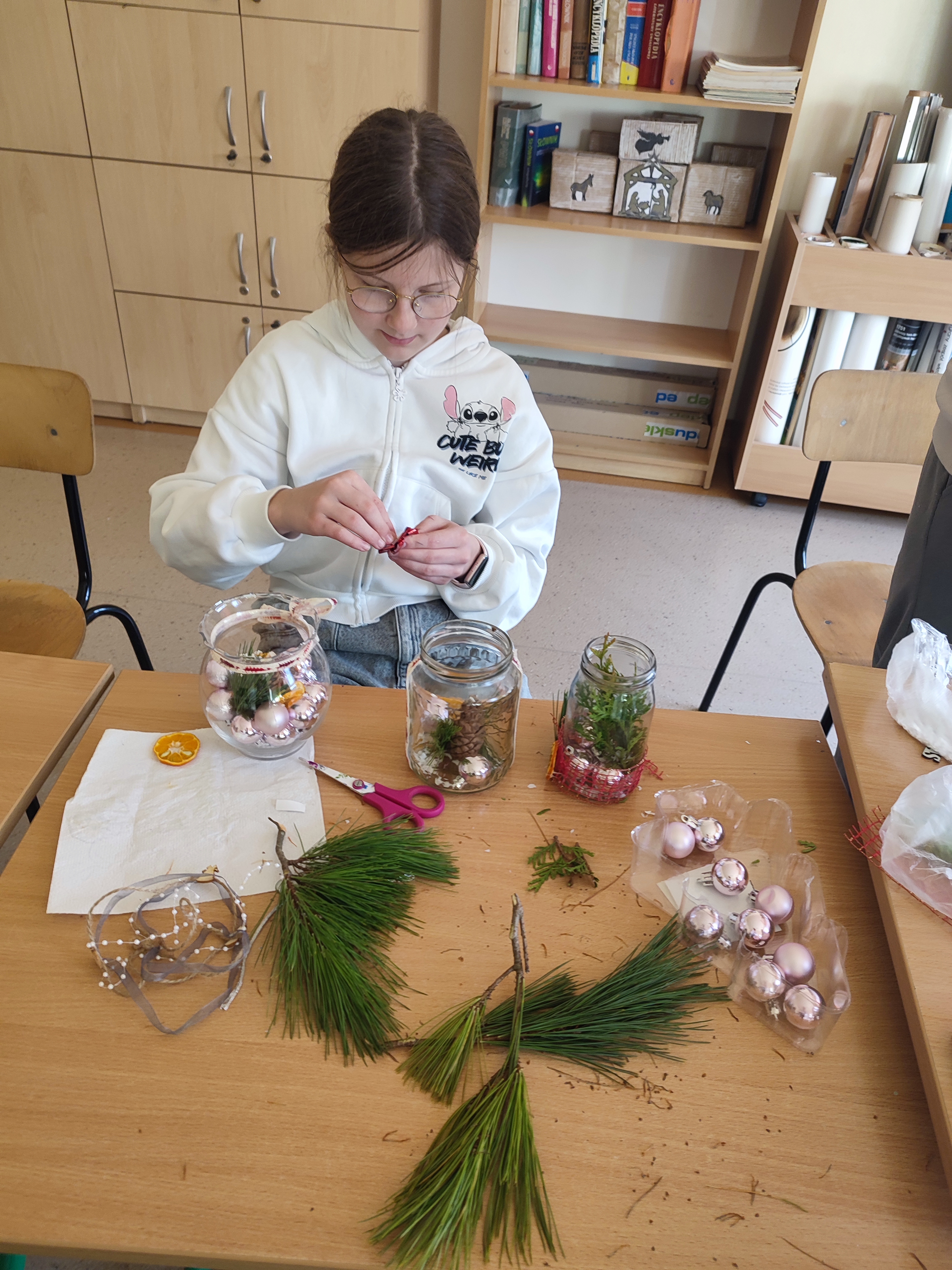 Podczas lekcji plastyki i techniki uczniowie z dużym zaangażowaniem wykonywali własnoręcznie ozdoby świąteczne oraz kartki okolicznościowe. Przygotowane dekoracje posłużyły do udekorowania szkoły.Wykonane kartki zostaną natomiast podarowane bliskim. Uczniowie wykazali się kreatywnością, pomysłowością oraz starannością, a zajęcia były doskonałą okazją do wprowadzenia w atmosferę świąteczną.