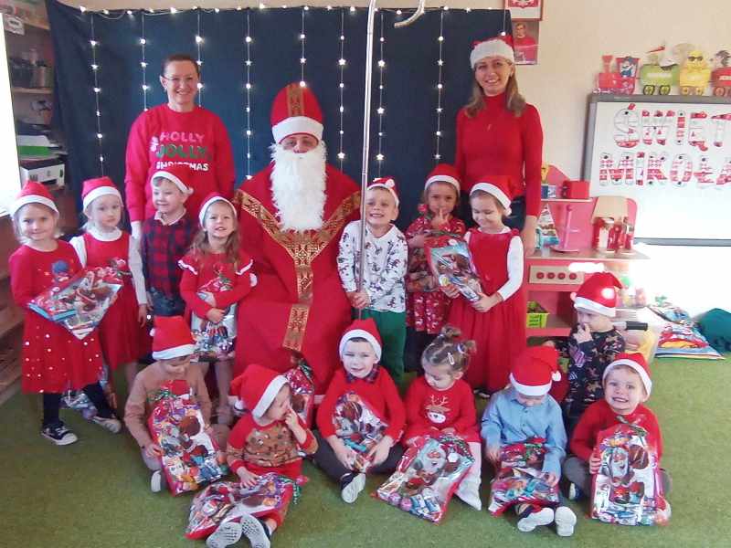 Wizyta świętego Mikołaja w naszym przedszkolu, to jeden z najbardziej oczekiwanych przez dzieci dni w roku. Już pod koniec listopada przedszkolaki pod okiem swoich pań „pisały” listy do Św. Mikołaja, w których rysowały swoje marzenia dotyczące upragnionych prezentów. Pilnie uczyły się piosenki i wierszyków. W piątek 6 grudnia już od samego rana czekały na Mikołaja, nadsłuchiwały dźwięku dzwoneczków, które słychać było z oddali. I już wiadomo było, że do przedszkola zbliża się nikt inny, jak …Święty Mikołaj. Wszystkie przedszkolaki bardzo przeżywały to spotkanie, dzieci z ogromną radością przywitały Go śpiewając mu piosenki i recytując wiersze. Każde dziecko złożyło obietnice, iż kolejny rok będzie grzeczne i posłuszne. Na zakończenie Święty Mikołaj wszystkim przedszkolakom osobiście przekazał piękne prezenty, a w nich – dla każdego coś dobrego.