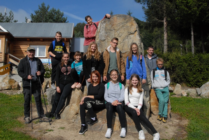 Pierwszego dnia kalendarzowej jesieni wybraliśmy się na całodniową wycieczkę do „Chaty pod Wałem”. Wędrowaliśmy niebieskim i żółtym szlakiem turystycznym. Pomimo mgły humory nam dopisywały i często zatrzymywaliśmy się w ciekawych miejscach. Po dotarciu do celu bardzo gościnnie zostaliśmy przyjęci przez państwa Marię i Marka Kamienieckich. Jedliśmy przepyszną kiełbaskę z grilla, a na deser upieczone ziemniaczki przygotowane przez Igora. Zagraliśmy mecz siatkówki, wylegiwaliśmy się na hamakach i po zrobieniu pamiątkowych zdjęć przyszedł czas powrotu przez pobliski kamieniołom. Naszym zdaniem była to bardzo udana wycieczka. Opiekę nad nami sprawowali pan Marek Marchwica i nasza wychowawczyni pani Joanna Łaś.