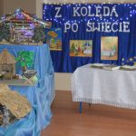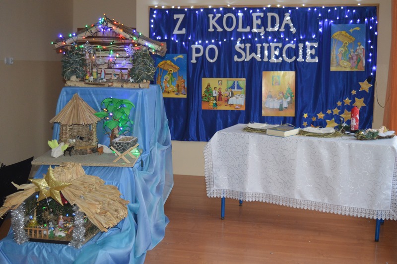 Poprzez czytane słowo komentarza i zdjęcia na wyświetlanej prezentacji komputerowej przenieśliśmy się kolejno do Ameryki Południowej – Peru, Ameryki Północnej – Stanów Zjednoczonych, Afryki, Australii, Azji – Tajlandii i Europy – Hiszpanii, Wielkiej Brytanii, Niemiec, Austrii, Włoch i Polski. Oczywiście teksty czytane przez uczniów i zdjęcia na przygotowanej prezentacji ukazywały zwyczaje świąteczne panujące w różnych miejscach świata. Nie zabrakło też kolęd w języku angielskim i niemieckim. Po programie artystycznym zatytułowanym „Z kolędą po świecie” zostało wniesione przez harcerkę Betlejemskie Światło Pokoju od którego Pani Dyrektor zapaliła świecę wigilijną. Następnie przybliżyła symbolikę Betlejemskiego Światła. Już po raz 27 zapłonęło w Polsce Betlejemskie Światło Pokoju. To płomień, który został rozpalony w Grocie Narodzenia Pańskiego w Betlejem. Niesiony rękoma skautów, przebył drogę aż do naszego kraju. Jest to znak braterstwa, jedności i pokoju, nieodłączny element adwentowego przygotowania do Świąt Bożego Narodzenia. Następnie został odczytany fragment Ewangelii według św. Łukasza o Narodzeniu Pańskim, a następnie uczniowie i ich wychowawcy oraz nauczyciele dzielili się opłatkiem, składając sobie najlepsze życzenia świąteczne i noworoczne. Po tym jakże miłym akcencie nastąpiło wspólne kolędowanie.
