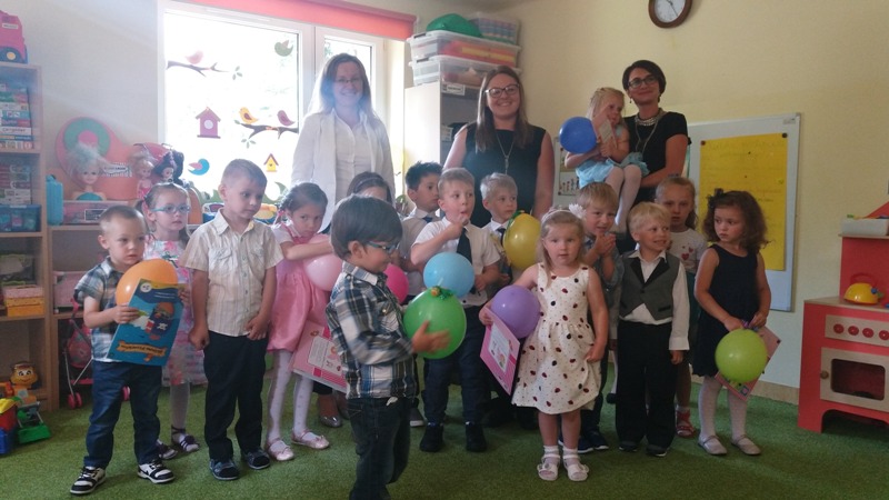 Dziękujemy wam drogie Dzieci – za codzienny uśmiech i radość jaką nas obdarowywałyście, za entuzjazm i spontaniczność, za to, że mogłyśmy się tyle od was nauczyć przez cały ten rok. Drodzy Rodzice gratulujemy wam tak wspaniałych dzieci. Życzymy wam pociechy i zadowolenia z nich w przyszłości. Dziękujemy również za pyszny tort, którym wspólnie częstowaliśmy się przy kawie i soczku.