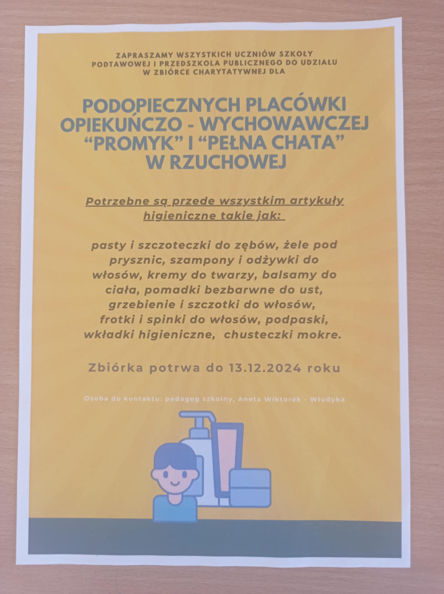 W Szkole Podstawowej i w Publicznym Przedszkolu została zorganizowana zbiórka charytatywna dla podopiecznych Placówki Opiekuńczo – Wychowawczej „Promyk” i „Pełna Chata” w Rzuchowej. Dzieci przynosiły produkty do pielęgnacji i higieny ciała oraz akcesoria do włosów. Zbiórka trwała do 13 grudnia 2024 r., dnia 17 grudnia zebrane produkty zostały dostarczone do Domu Dziecka. Serdecznie dziękujemy wszystkim, którzy przyłączyli się do akcji.